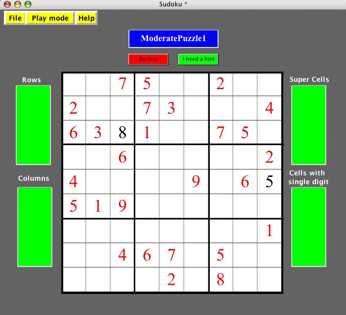 The screen-shot below shows Sudoku Utility used as a solution tool. The given digits are in red and those inserted by the user are black. The "Backup" button allows for undoes, and "I need a hint" button will put a question mark in a cell which has a determined value at the existing stage of solution. You may also choose to select the mode of play in which the application will refuse any wrong entry; you cannot make a mistake--comforting.