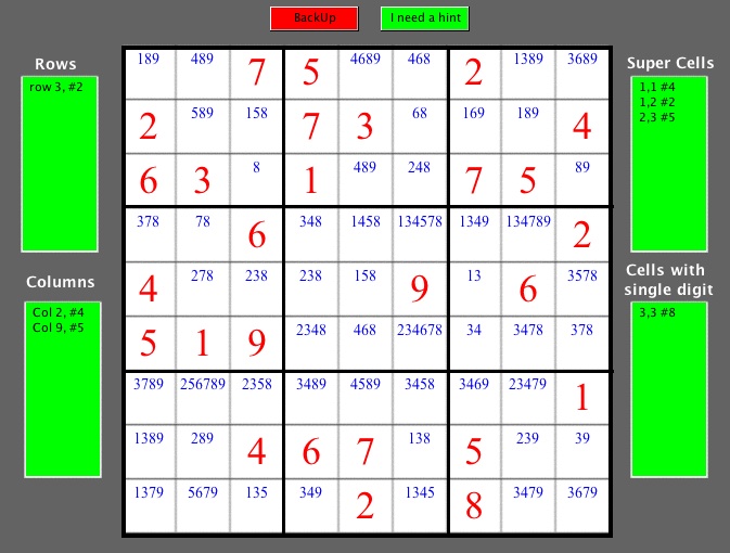 For example you see an 8 in cell Row 3, Column 3. This means that only an 8 is allowed in that cell. All OTHER digits are forbidden. You also see this information contained in the green field where it shows 3,3 #8; as you search along that row you see there is only one cell which allows an 8.