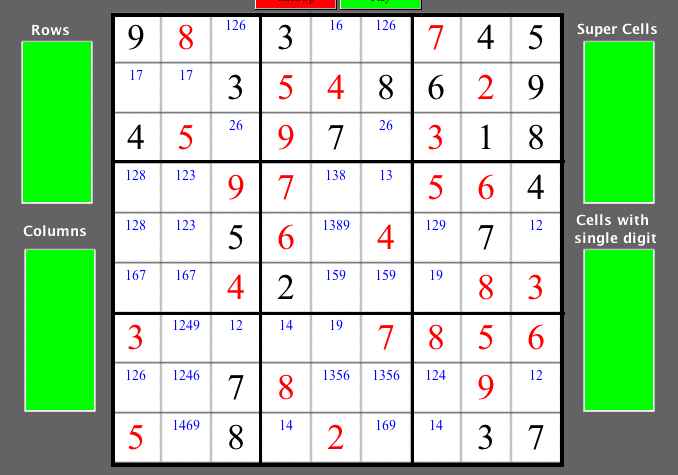 You also see in the column titled "Rows" the line: "row 3, #2", meaning that in row 3 there is only one cell in which a 2 is allowed; as you can see, that cell is row 3, column 6.